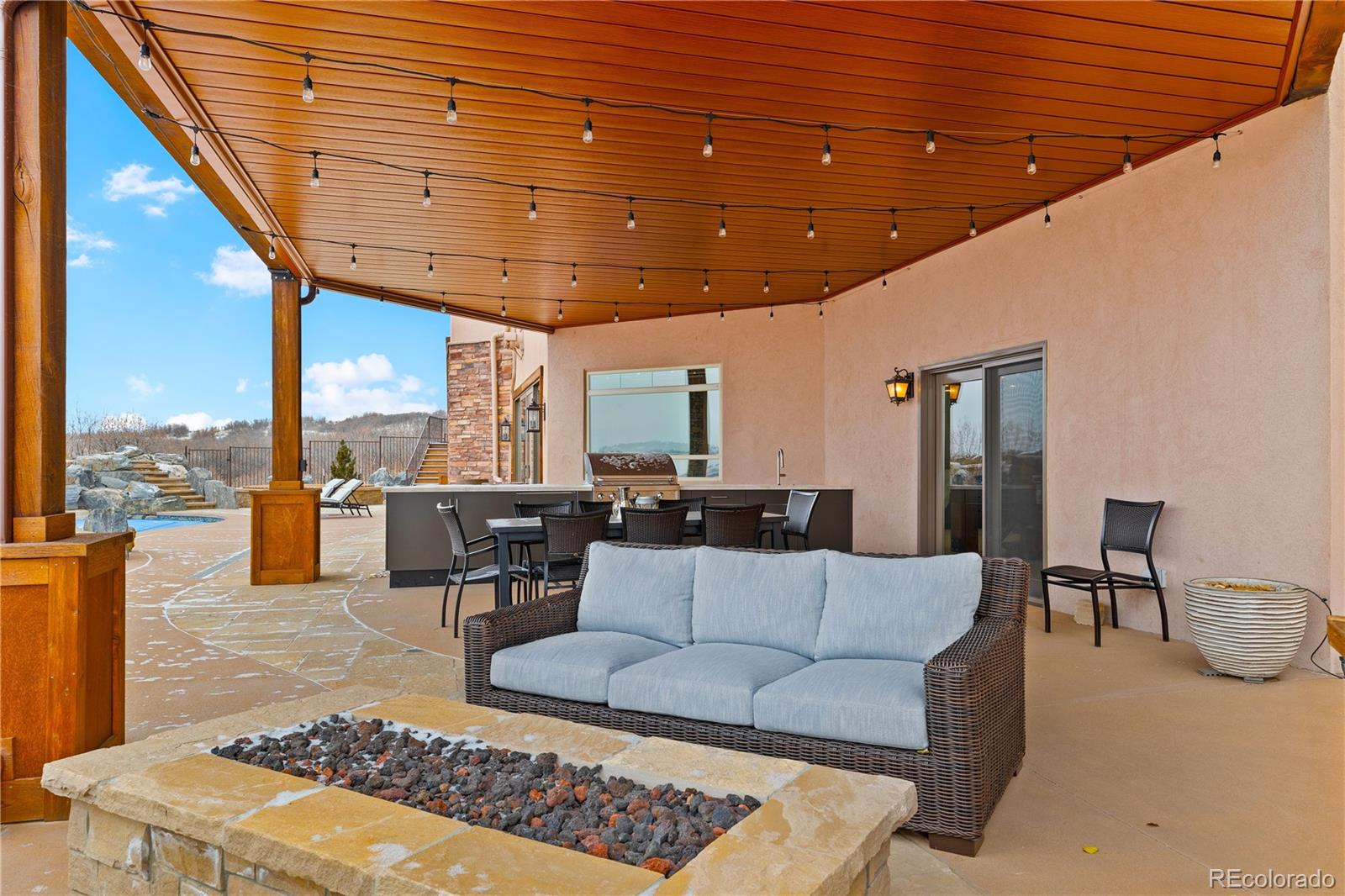 2505 Big Bear Circle is a truly irresistible Ranch estate in Bear Canyon Ranch. This sanctuary offers breathtaking, unobstructed views of Devil's Head Mountain and 51 acres of rolling pastures. The custom-built main residence boasts over 12,009 sq. ft. of meticulously designed living space. As you enter the soaring foyer, you're greeted by dramatic tongue-and-groove high ceilings, rustic wooden floors and a spectacular view of the mountains! The main living area is a masterpiece of design and functionality, featuring a spacious open floor plan ideal for relaxing with family or gracious entertaining. The oversized dining area, beautiful hearth, chef's kitchen & breakfast dining terrace with panoramic mountain views invite you to enjoy your morning coffee overlooking the front range or relish a sunset over Devil's Head in the evening. The primary suite is a tranquil sanctuary with a sitting area, fireplace, two separate walk-in closets & a spa-like six-piece bath. Two additional main-floor bedrooms feature en-suite baths and private decks. The walk-out lower level is an entertainer's dream: a home theater, game area, full wet bar, and workout room with two more bedrooms. The walkout with its mountain views is the ideal space for enjoying time with family & friends alike. The home's elevator allows easy access to every floor with a push of a button. A complete resort-style $1.8 million renovation was just completed by acclaimed Designs by Sundown, featuring a swimming pool with a waterfall rock feature & diving platform, in-ground spa, full outdoor kitchen, a firepit entertainment area & sports court. Boasting a 2,210 sq. ft. barn with a bathroom, electricity, water, a furnished 2 bed/ 1 bath caretaker residence & attached two-car garage, this ranch's agricultural zoning, fenced pastures & dual wells make it an idyllic haven for equestrians, ranchers & outdoor enthusiasts alike. Only 10 minutes from renowned downtown Castle Rock shopping & dining!
